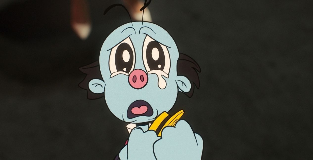 Ultimately, Pye aids Lux, who appears as Mr Ring-A-Ding, an entirely two-dimensional cartoon character. He’s unnerving and frightening even when being cheerful. At the outset, he is presented like a classic Looney Tunes character. But something is bubbling underneath that is sinister and horrifying when realized. Even when being friendly and welcoming, his energy is unsettling. Alan Cumming’s voice acting gives the character real gravitas. He has the positive and noisy exuberance that figures like Bugs Bunny have, but laced within it is a monstrous undertone.
