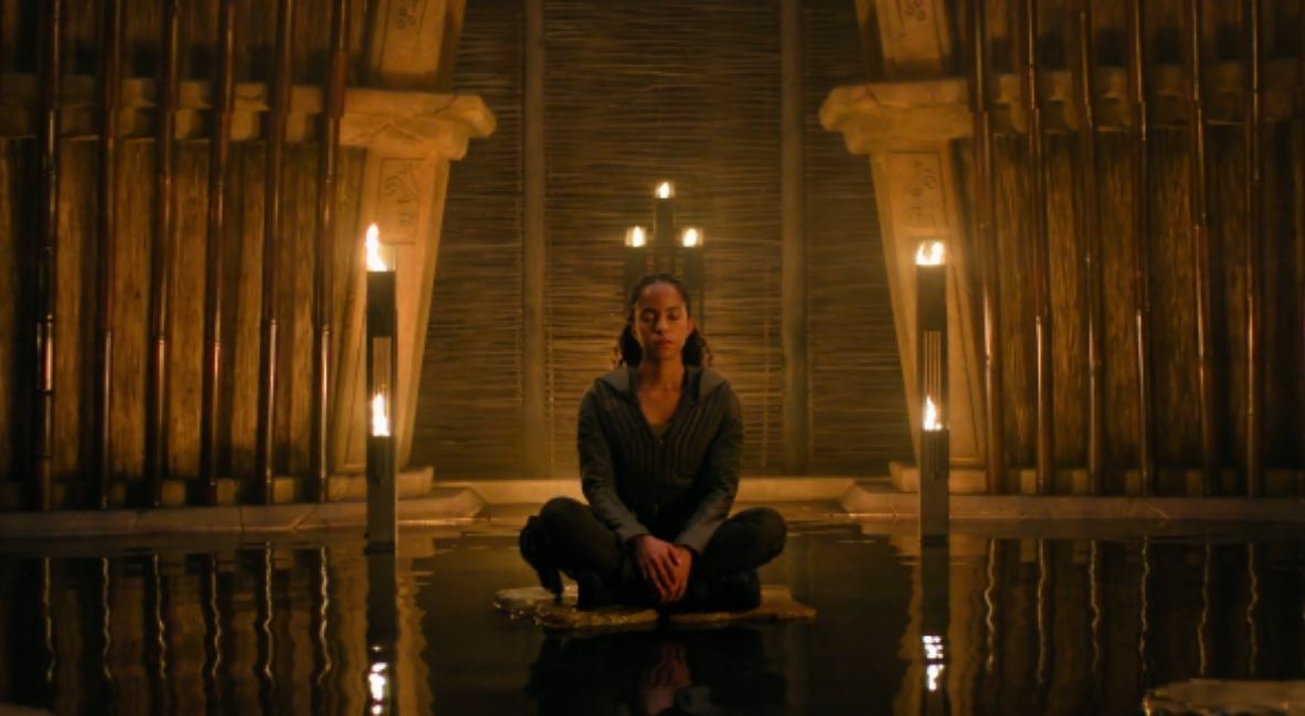 The Mule takes out one of their number quickly, but most of the rest of them fall for the ol’ visual projection trick, and soon it’s Gaal one-on-one against the Mule. She’s losing. The Mule gets into her head, but Gaal manages to get out of being forced to shoot herself, and when he starts choking her (bad move, we know that and drowning are a Gaal power-up), the fight moves into her head.