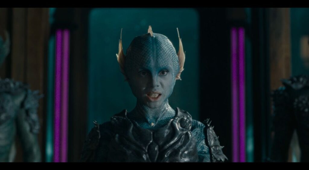 The War Between the Land and the Sea has a structure not seen in a Whoniverse show since Torchwood and Class. A single series focused on one topic. This means it’s got more time to evolve and focus on the chargers. But actually, the episodes are used well, moving quickly to introduce many elements at once. The two worlds collide, with bodies on both sides and tensions building. From the beginning, the world is on a knife’s edge. Then comes the negotiations, where the tension is a thick fog in a room full of generals and politicians.